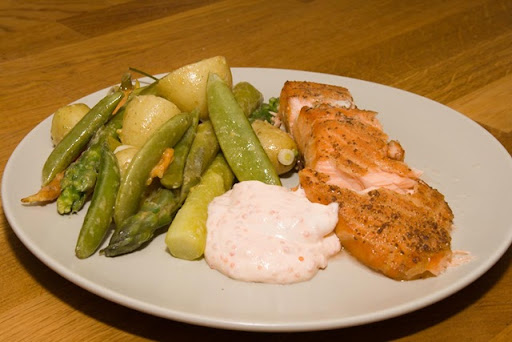Till blir det som sagt primörer; potatis, sparris, små söta morötter, strimlad salladslök, sugarsnaps. Lite vinägrett med sparrisolja, äppelcidervinäger, dijonsenap och en gnutta salt. Enklaste möjliga romsås; creme fraiche och stenbitsrom.