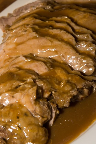 4. Häll marinaden över köttet i grytan och ställ in i ugnen på 125 grader tills temperaturn är 75 grader ungefär. Det tog nästan 2,5 timmar.