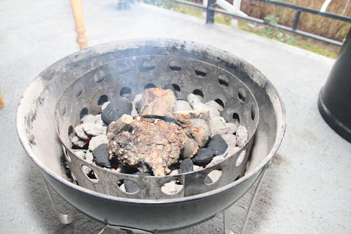 Så. Först fyller man ett tändrör helt med briketter och tänder på. Efter en trekvart eller så är alla briketter tända och grå. Då är det dags att hälla över dem i röken.