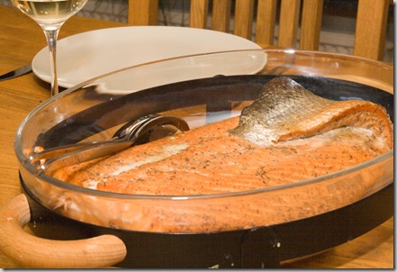 Vi enas om att det här är den bästa lax vi gjort. Precis lagom sälta, diskret röksmak, mjuk och len konsistens, precis färdig men inte mer. Så gott! Och så ett urgott vitt vin till; Jurtschitsch Zöbinger Heiligenstein 2006, riktigt härlig riesling.